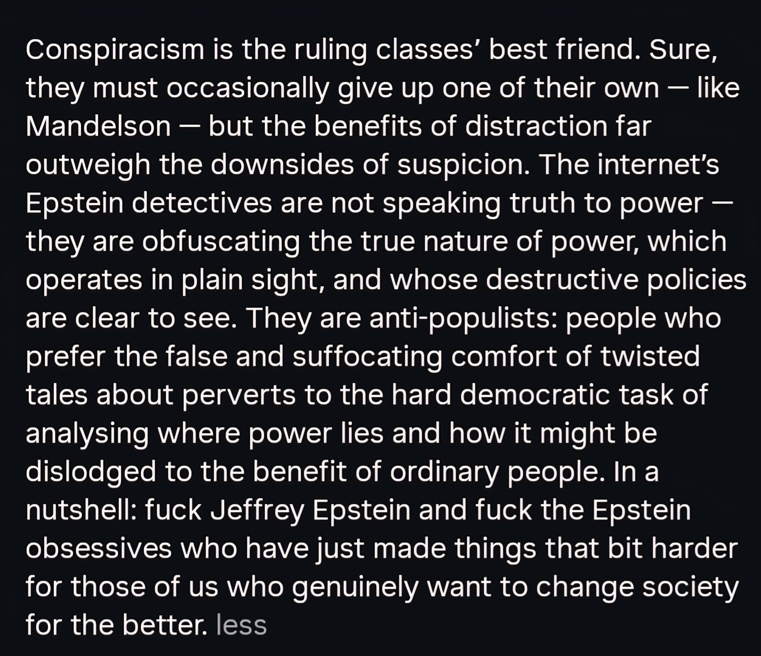 I thought this clip was going to have some good thoughts about the Epstein saga, but after a minute or two, it was apparent that the narrator is just another believer and I stopped watching.