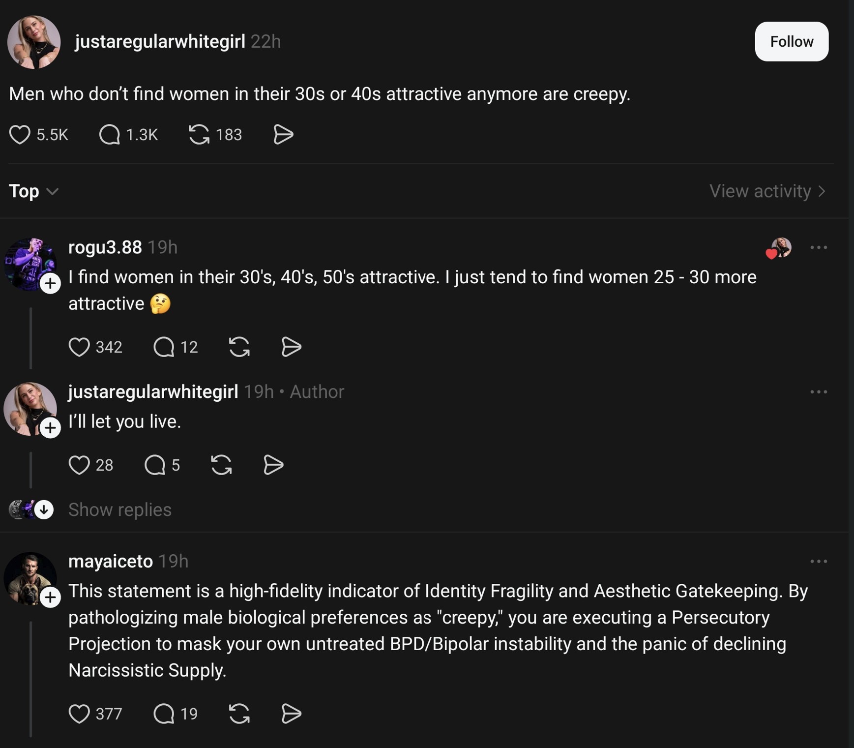 And one comment: “Agecuckery and moralfaggotry are mental illnesses, any sane man would want a teenage foid and not an old hag”.