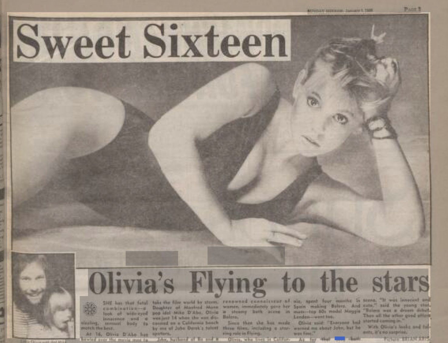 “SHE has that fatal combination—a look of wide-eyed innocence and a sizzling, sensual body to match the best. At 16, Olivia D’Abo has bowled over the movie men to take the film world by storm. Daughter of Manfred Mann pop idol Mike D’Abo, Olivia was just 14 when she was discovered on a California beach by one of John Derek’s talent spotters, John, husband of Bo and a renowned connoisseur of women, immediately gave her a steamy bath scene in Bolero, Since then she has made three films, including a star- ring role in Flying. Olivia, who lives in California, spent four months in Spain making Bolero. And mum—top 60s model Maggie Londan—went too. Olivia said: ‘Everyone had ‘warned me about John, but he was As for that sexy bath scene. “It was innocent and cute,” said the young star. “Bolero was a dream debut, Then all the other good offers started coming in.’ ”